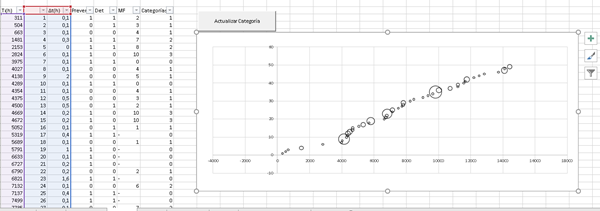 Necesito ayuda para que el diagrama de burbujas tome colores según condición, por ejemplo si en la columna categoría su valor es 1 sea rojo, 2 sea verde 3, sea azul y si en la columna Det el valor es 1 la circunferencia sea gruesa, y si es 0 sea delgada. ¿Hay forma de programar eso?