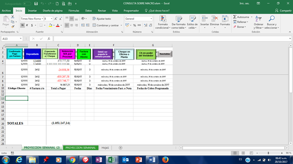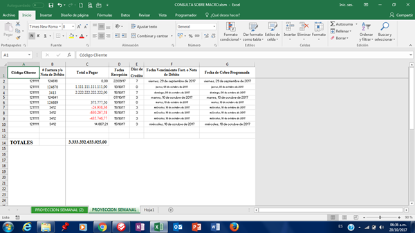 Gusto en saludarles. En esta ocasión solicito su apreciado apoyo en el siguiente tema: Investigando en internet encontré una macro que hace lo que necesito, es decir; al ir introduciendo facturas las ordena de forma automática por fecha programada de cobro. La he probado en una hoja donde el encabezado del cuadro esta en la primera fila y funciona excelente (tal como lo muestra la siguiente imagen):
