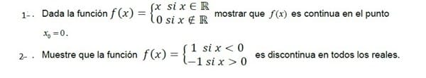 $$\begin{align}&\lim_{x \to a}f(x)=f(a)\\&1)\\&\lim_{x \to 0}f(x)=\lim_{x \to 0}x=0\\&f(0)=0\\&Continiua\\&\\&2)\\&\lim_{x \to 0^-}f(x)=\lim_{x \to 0}1=1\\&\\&\lim_{x \to 0^+}f(x)=\lim_{x \to 0^+}(-1)=-1\\&==>\\&\not \exists \ \ \lim_{x \to 1}\\&\not \exists \ f(0)\\&==> Solo \ Es \ discontinua \ en \ x=0 \\&\\&3)\\&f(1)=0\\&\lim_{x \to 1^-}f(x)=2\\&\lim_{x \to 1^+}f(x)=0\\&\\&==>\\&\not \exists \lim_{x \to 1} \\ \text{porque los límites laterales no coinciden}\end{align}$$