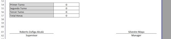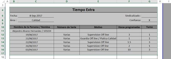 La columna B y C se encuentran conbinadas y el nombre del supervisor responsable empieza en la columna B11 y ésta quiero que no se pueda mover el contenido para evitar que existan diferencias en caso de que se busque como referencia para la condicion, abajo de ésta celda se empiezan anotar las fechas de cuando se quedaron tiempo extra, en la D12 se anota por lo regular "varias", en la E12 se anota el motivo, en la F12 se anotan las horas programadas y en la G12 se anota el turno "1, 2 o 3".