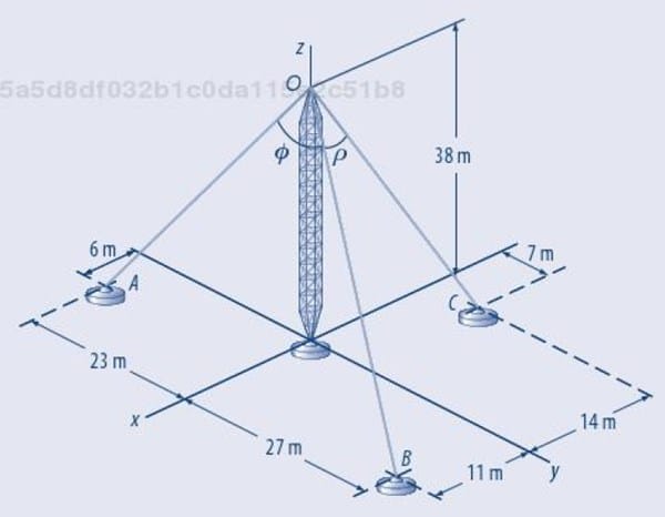 $$\begin{align}&AB^2=(23+27)^2+(11-6)^2=50^2+5^2=2525\\&\\&Sea \ Q\ la \ base \ de \ la \ torre:\\&AQ^2=6^2+23^2=565\\&AO^2=AQ^2+OQ^2=565+38^2=2009\\&QB^2=27^2+11^2=850\\&OB^2=OQ^2+QB^2=38^2+850=2294\\&\\&\\&Teorema\ coseno\ el \ triangulo AOB:\\&AB^2=OA^2+OB^2-2·OA·OB·\cos \phi\\&\\&\cos \phi=\frac{OA^2+OB^2-AB^2}{2·OA·OB}=\frac{2009+2294-2525}{2·\sqrt{2009}\sqrt{2294}}=0.4141\\&\\&\phi= arccos(0.4141)=65.5367º\\&\\&\\&BC^2=(27-7)^2+(14+11)^2=20^2+25^2=1025\\&\\&QC^2=14^2+7^2=245\\&\\&OC^2=38^2+245=1689\\&\\&Teorema\ coseno\ el \ triangulo OBC:\\&BC^2=OB^2+OC^2-2·OB·OC·\cos \rho\\&\\&\cos \rho=\frac{OB^2+OC^2-BC^2}{2·OB·OC}= \frac{2294+1689-1025}{2 \sqrt{2294} \sqrt{1689}}=0.7514\\&\\&\rho= arccos(0.7514)=41.2904º\\&\\&\\&\\&\\&AC^2=(6+14)^2+23^2=400+529=929\\&Teorema \ coseno\ triángulo:\ AOC\\&AC^2=AO^2+OC^2-2·AO·OC·\cos \alpha\\&\\&\cos \alpha=\frac{AO^2+OC^2-AC^2}{2·AO·OC}=\frac{2009+1689-929}{2 \sqrt{2009} \sqrt {1689}}=0.7516\\&\\&\alpha= arccos(0.7516)=41.2706º\\&\\&\end{align}$$