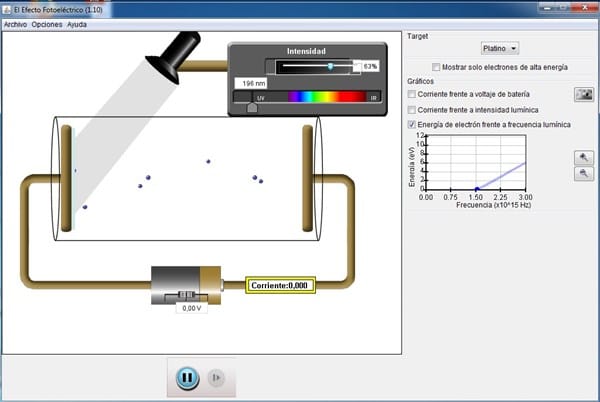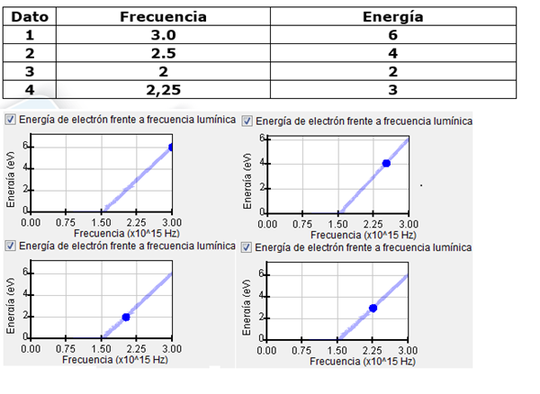 - Para el material seleccionado, identifique en el simulador la gráfica “ENERGÍA DE ELECTRÓN FRENTE A FRECUENCIA LUMÍNICA” y a partir de ella encuentre la constante de Planck y la función de trabajo experimental, con su respectivo error porcentual. Para lo anterior es necesario identificar mínimo tres puntos de la gráfica, para ello complete la tabla siguiente: