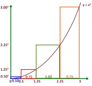 f(x)= x2, 0 ≤ x ≤ 3, para Δ: x0 = 0, x1 = ½, x2 = 1 ¼, x3 = 2 ¼, x4 = 3.