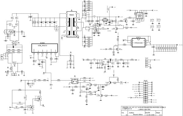 La TV la he abierto, y he localizado la fuente. He probado voltajes de salida a la main board y son bastante similares a los que deben salir según esquema, que he podido conseguir. Pero si he detectado que en algunos de los pines de salida, en concreto los de 12v, nada mas encenderla da una tensión aproximada a 12v, y a los 5 segundos decae 1v aproximadamente. No se si esto dará alguna pista