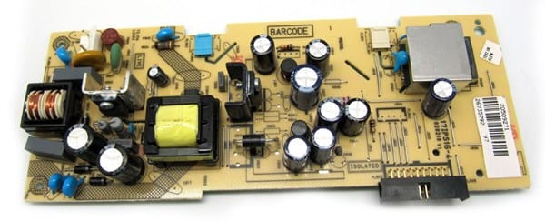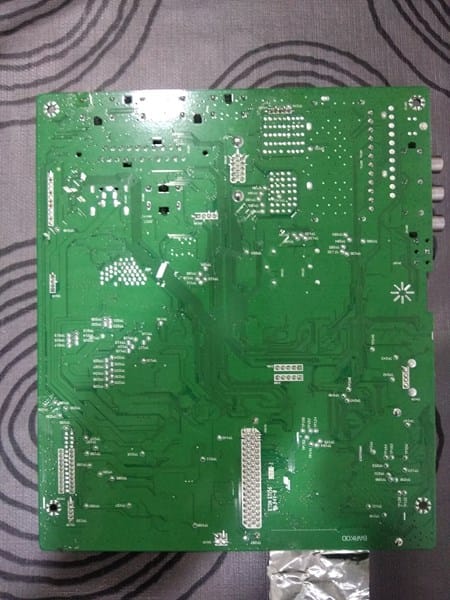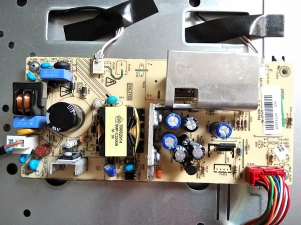 Es posible que si desmontas tu TV (la tapa de atrás simplemente sacando unos tornillos del pie y sobretodo del perímetro del TV pero a veces también del centro) te encontraras con esta placa, es la fuente de alimentación: