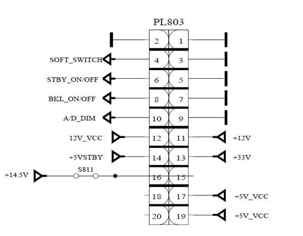 Si es así, entonces desconecta el cable en el conector PL803 y verifica si al menos tienes el voltaje stand-by [B]en la fuente de poder[/B] [B](pin 14)[/B]. Si ese voltaje está presente, lo que habría que hacer es simular el pulso de encendido (sin la mainboard conectada obviamente), y verificar si están los voltajes del secundario. Si es que estuvieran, tendrías que fijarte si la fuente sigue emitiendo ese pitido, ya que si no lo hace, sería un indicador de que la mainboard te hace oscilar mal la fuente, ya que presenta algún cortocircuito.