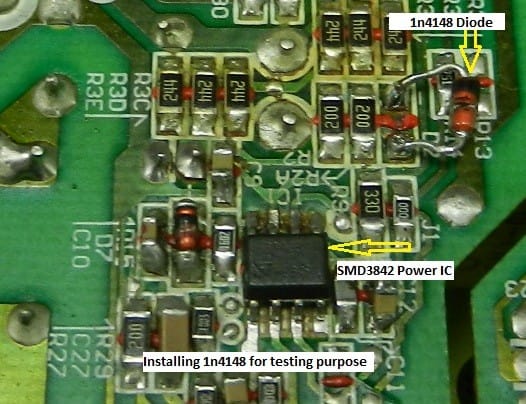 He comprobado los diodos del puente de diodos y el resto y todos marcan bien. Se me ha ocurrido desconectar la mainboard y entonces marcaban bien todos los pines, por lo que el problema debe ser algun corto o similar en la placa base. No se por donde tirar. Esto ya se pone complicado