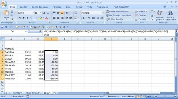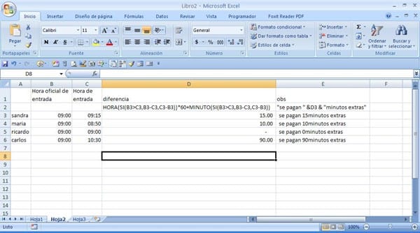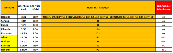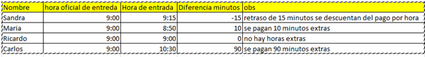 La idea es escribir la hora oficial de entrada, hora real de entrada y con eso me de la cantidad de minutos extras o retrasos para cada trabajador.