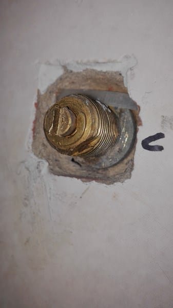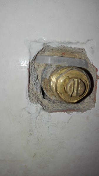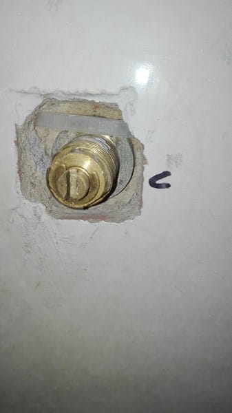Dispuesto a cambiar esta llave de paso ya que anda rigidísima me toca escarbar un poco hasta descubrir la llave por completo ya que estaba tapada por el cemento usado para pegar el azulejo y cuando ya la tengo a la vista me encuentro que está como amarrada con un precinto, ya no me atrevo a cortarlo sin más por si acaso. Subo más fotos para que se vea bien.