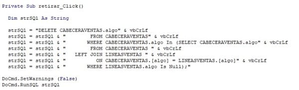 Necesito eliminar de la Tabla: (CABECERAVENTAS) los registros que NO tienen ningún registro en la tabla Líneas Ventas (LINEASVENTAS)