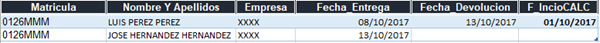 En el ejemplo vemos que el vehículo 0126MMM se le entregó a este señor (ficticio) el día 8/10 pero he creado un campo llamado F_InicioCALC en el que quiero que en este caso aparezca el día de inicio, en este caso el 01/10/2017. Lo puede hacer en este campo nuevo o simplemente cambiar el de F_Entrega y en vez de poner 08/10 poner 01/10.