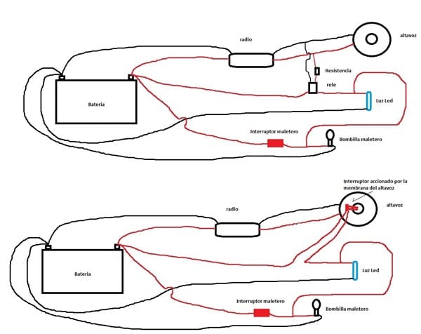 Puedes usar un relé y una resistencia, tomas el rojo y negro del altavoz, y mediante una resistencia (para reducir los amperios que pasen por el relé) pones en la parte de interrupción del relé el encendido y apagado de dichas luces. Para que se encienda cuando se abra el maletero solo tienes que sacar un cable positivo de la luz del maletero y conectarselo después de la interrupción del relé. De esa forma el circuito led sera alimentado por la luz del maletero y no por los alravoces. El problema es que no hará rítmica cuando tengas abierto el maletero. Si necesitas un esquema te lo puedo hacer. La resistencia es quizás lo más complicado de calcular. Debería ser bastante más alta que la del altavoz dado que queremos que más del 90% de la corriente vaya al altavoz y con un 5 o 10% de la corriente abra el relé, la otra cuestión es que voltaje llegara después de pasar la resistencia, seguramente un relé de 12V no lo activara, debería ser de menos. Sin contar que una bobina conectada en medio del camino del altavoz podría generar "ruido" al altavoz. Si te sobra alguna salida de altavoz podrías usarla sola, sin altavoz, o anular alguno de los altavoces para conectar solo el relé. La verdad es que nunca lo he hecho, pero en teoría podría pasar lo que te he comentado. Luego se me ocurre una locura pero quizás es lo que menos afectaría al sonido, utilizar la propia vibración del altavoz como interruptor. Usando un pulsador con doble lengüeta:
