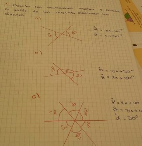 $$\begin{align}&Sabemos\ que\\&\text{Por ser angulos opuestos por el vértice}\\&\alpha = \epsilon\\&\beta = \theta\\&\gamma = \omega\\&\text{Y que cualesquiera 3 ángulos consecutivos suman 180°, en particular}\\&\gamma + \epsilon + \theta = 180°\\&\gamma + \alpha + \theta = 180°\\&2x+40 + 30 + 3x+10 = 180\\&5x + 80 = 180\\&5x = 100\\&x = 20\\&\therefore\\&\alpha = \epsilon = 30\\&\beta = \theta = 3\cdot 20 + 10 = 70\\&\gamma = \omega = 2 \cdot 20 + 40 = 80\end{align}$$y eso es todo