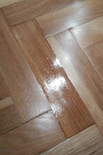 Al revisar el resultado en algunas tablillas (5 o 6) hemos observado que han quedado algunos pequeños “grumos” de barniz. Así que el parquetista lo ha arreglado lijando las tablillas afectadas y barnizando de nuevo esas tablillas. Este arreglo se ha hecho en menos de 1 semana desde el barnizado y sin haber usado la vivienda.