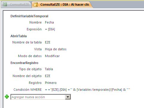A parte de esto, en un informe que se llama "ConsultaEZE" quiero que, cuando se clique en el campo "DIA" (donde se muestra la misma info que la tabla) me abra la tabla "EZE" y en el registro correspondiente.