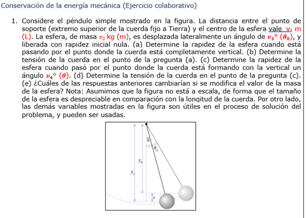 1. Considere el péndulo simple mostrado en la figura. La distancia entre el punto de soporte (extremo superior de la cuerda fijo a Tierra) y el centro de la esfera vale v1 m (L). La esfera, de masa kg (m), es desplazada lateralmente un ángulo de ° (), y liberada con rapidez inicial nula. (a) Determine la rapidez de la esfera cuando está pasando por el punto donde la cuerda está completamente vertical. (b) Determine la tensión de la cuerda en el punto de la pregunta (a). (c) Determine la rapidez de la esfera cuando pasó por el punto donde la cuerda está formando con la vertical un ángulo ° (). (d) Determine la tensión de la cuerda en el punto de la pregunta (c). (e) ¿Cuáles de las respuestas anteriores cambiarían si se modifica el valor de la masa de la esfera? Nota: Asumimos que la figura no está a escala, de forma que el tamaño de la esfera es despreciable en comparación con la longitud de la cuerda. Por otro lado, las demás variables mostradas en la figura son útiles en el proceso de solución del problema, y pueden ser usadas.