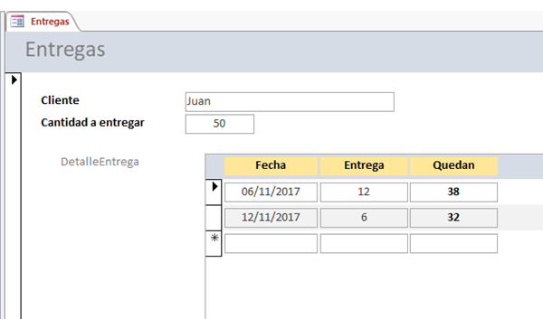 Como te decía todo depende de como tengas construida la base. Te pongo un ejemplo, si tengo una tabla Entregas con Identrega(clave), cliente, etc, Cantidad(total a entregar)... y otra tabla relacionada con ella DetalleEntrega con Identrega, fecha, cantidad, quedan y hago un formulario con subformulario como en la imagen