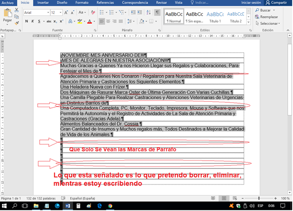 Mi Intención es Borrar, Eliminar las líneas que aparecen debajo de las marcas de párrafo, las que están señaladas con Color Rojo.
