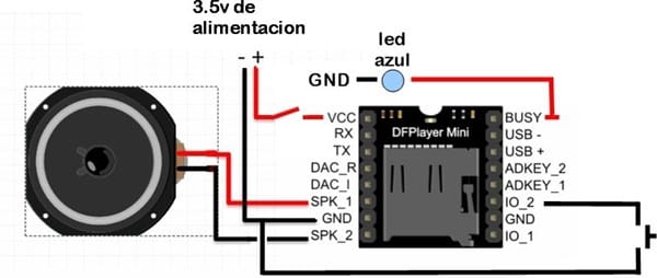 Le doy contacto a la alimentación y automáticamente me prende el led azul en lugar de activarse después de presionar el pulsador al comenzar a reproducir la pista, siendo que cuando reproduce se apaga.