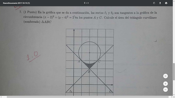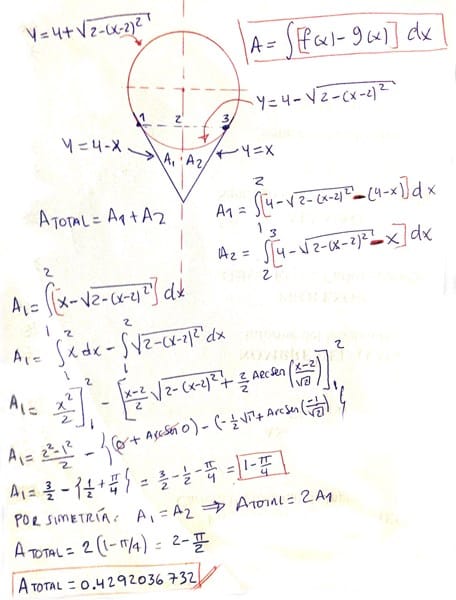 Ya tienes la respuesta como la pediste (mediante integrales). No se que tan estricto sea tu profesor, pero si yo veo ese ejercicio nunca se me hubiese ocurrido resolverlo mediante integrales, sino que lo haría directamente usando los conocimientos 'básicos' de geometría, ya que tenemos un círculo de diámetro 2 * raíz de 2 y un cuadrado de igual lado. Dicho esto vemos que el área buscada es un cuarto del área que queda entre la resta del área del cuadrado menos la del círculo. O sea