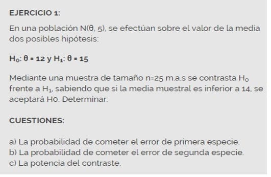 En una población N (θ, 5), se efectúan sobre el valor de la media dos posibles hipótesis: H0: θ = 12 y H1: θ = 15 Mediante una m