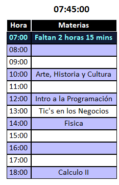 Hice que te diga cuanto falta para la siguiente hora, pero lo que quiero es que te diga cuanto falta para la siguiente clase, cabe mencionar que son ComboBox no hay nada en hojas de excel, quisiera saber si hay forma de que te diga cuanto falta para la siguiente Clase.