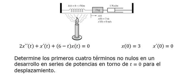 Al calentar un resorte, su “constante” decrece. Suponga que el resorte se calienta de modo que la “constante” en el instante t es k(t)=6- t N/m (véase la figura). Si el sistema masa-resorte sin forzamiento tiene masa m=2 kg y una constante de amortiguamiento b= 1Ns/m con condiciones iniciales x(0)=3m y x`(0), entonces el desplazamiento x(t) queda descrito mediante el problema de valores iniciales