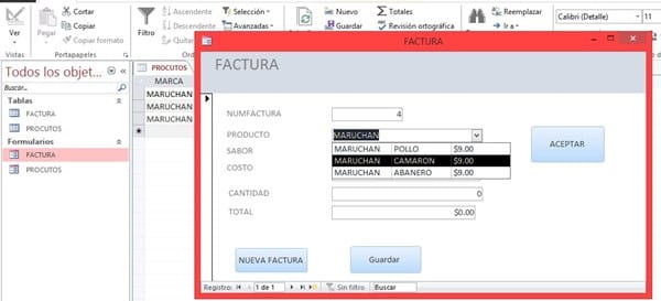 EN FACTURA tengo los siguientes campos: nom. Factura, producto, sabor, costo, cantida