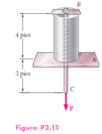 Una sección de tubería de aluminio de 4 pies, con área de 1.75 en su sección transversal, descansa sobre un soporte fijo en A. La varilla de acero BC con pulg de diámetro cuelga de una barra rígida que se apoya sobre la parte superior del tubo en B. Si se sabe que el modulo de elasticidad es de Si para el acero Para el aluminio, determine la deflexión del punto C cuando se aplica una fuerza de 15 Kip en C.