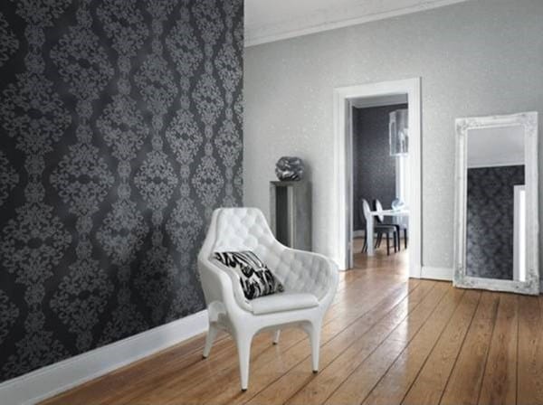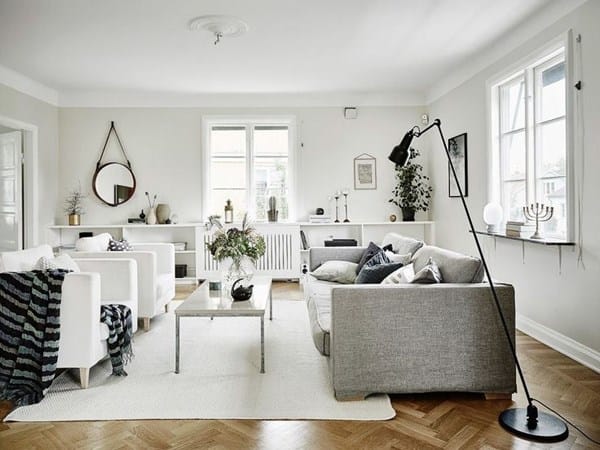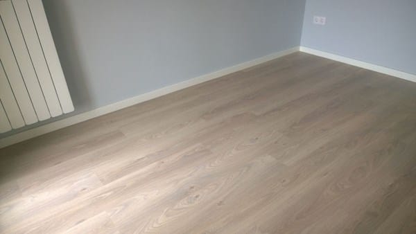 El suelo es parquet roble y el estilo de la vivienda moderno con predominio de muebles en blanco, negro y gris.