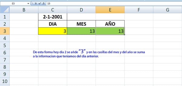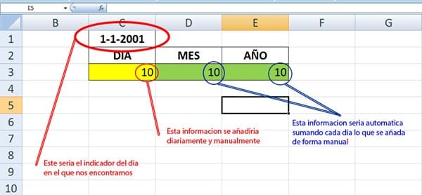 El ejemplo lo he simplificado y espero estar bien explicado. Cada día se añadiría la fecha en la celda "C1" y se añadiría un valor en la "C3". Ese valor es de un día, y se le sumaria lo anterior para tener el valor de la "D3" (valor mensual) y de igual forma el de "E3" (valor anual). Hasta aquí no tendría ningún problema en conseguir esos valores, el problema surge cuando llego al día siguiente: