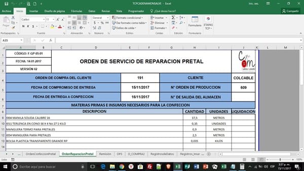 Buenas tardes, espero que me puedan colaborar. Tengo este situación tengo un formato orden de servicio, esta hoja se llama OrdenReparacionPretal, como se puede observar en la imagen y una hoja con datos llamada RegistrosdeDatos, están en el mismo libro.