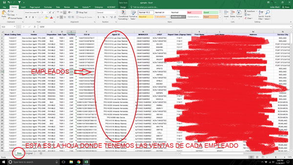 Tengo una hoja que se llama "Recibo", esta hoja tiene algunas fórmulas e información ya establecida, pero también tengo una hoja que se llama "Datos", en esta hoja tengo una pequeña base de datos de ventas.