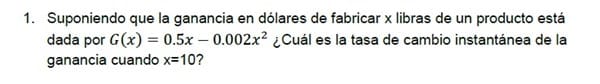 Como Sugerencia: La tasa de cambio instantánea es una razón de cambio que se llama ganancia marginal por lo tanto lo que se tiene que hacer es derivar la función dada y sustituir el valor de x=10 en la derivada encontrada.