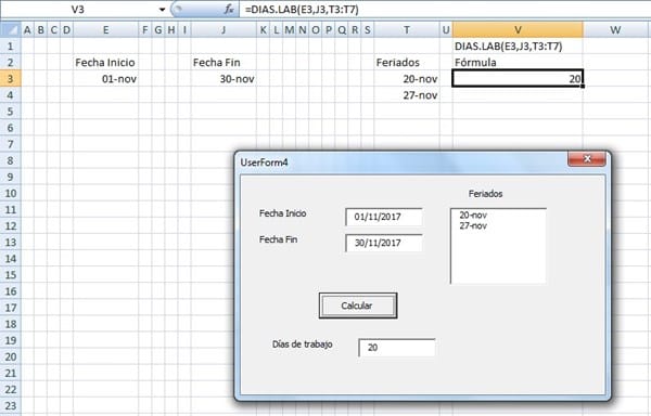 Tengo la fórmula de trabajo neto en alemán seria(=NETTOARBEITSTAGE(E3;J3;T3:T18)) en engles seria work(...), esta Función de excel tiene en excel una columna con los día no laborabe(feriados ) y la quiero en un formulario