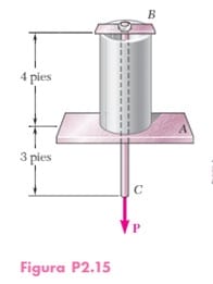2.15 Una sección de tubería de aluminio de 4 pies, con área de en sección transversal, descansa sobre un soporte fijo en A. La varilla de acero BC con de diámetro cuelga de una barra rígida que se apoya sobre la parte superior del tubo en B. Si se sabe que el módulo de elasticidad es de para el acero y para el aluminio, determine la deflexión del punto C cuando se aplica una fuerza de en C.