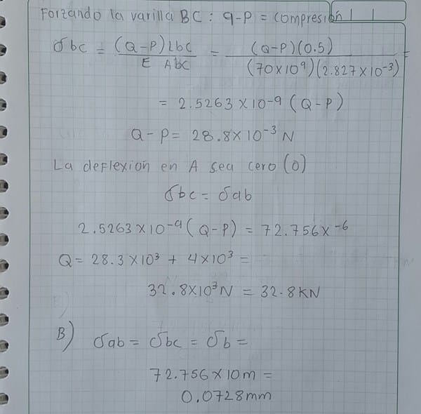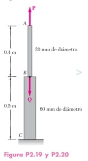 Las dos porciones de la varilla ABC están hechas de un aluminio para el que . Si se sabe que la magnitud de P es de 4kN, encuentre a) el valor de Q para que la deflexión en A sea cero, b) la deflexión correspondiente a B.