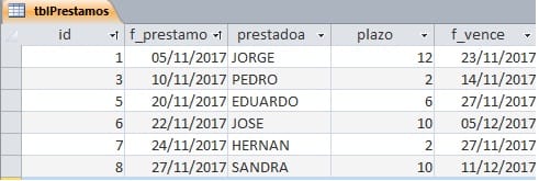 Ahh, se me olvidaba, la tabla contiene información sobre préstamo de documentos, es decir, un campo id, fecha préstamo, prestado a, etc.