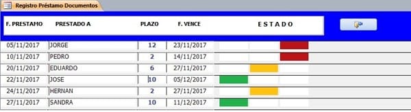 Necesito crear unas alertas en una BBDD para préstamo de documentos, las alertas serian, P. Vencer, vencido, activo.