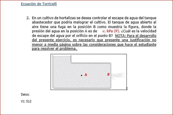 En un cultivo de hortalizas se desea controlar el escape de agua del tanque abastecedor que podría malograr el cultivo. El tanque de agua abierto al aire tiene una fuga en la posición B como muestra la figura, donde la presión del agua en la posición A es de v1 kPa (P). ¿Cuál es la velocidad de escape del agua por el orificio en el punto B? NOTA: Para el desarrollo del presente ejercicio, es necesario que presente una justificación no menor a media página sobre las consideraciones que hace el estudiante para resolver el problema.