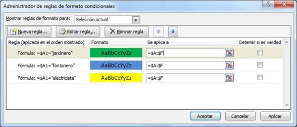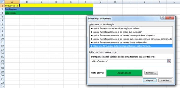 Tengo en la celda A1 varios condicionales con texto específico y quiero que se ponga el mismo formato que he puesto a las siguiente celdas de la fila, en A2, A3, A4,... Pudiendo poner yo en esas celdas el valor que quiera.