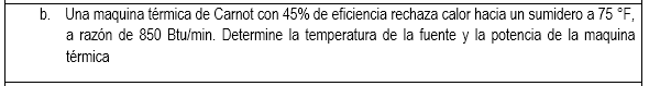 Siendo eficiencia= 1 - T2 / T1 = 0.45 = 1 - (75 / T1) .............T1 = 75 / 0.55 = 136.4 F.