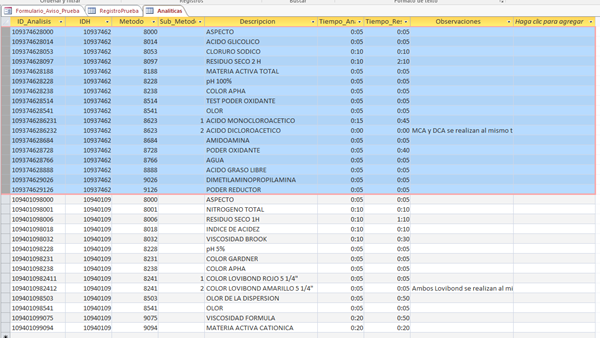 He creado una tabla donde relaciono cada producto con sus analíticas (IDH, Metodo, Sub_Metodo) y lo que quisiera hacer es que cuando se carguen los datos de IDH en el formulario, pueda abrir un campo combinado con selección múltiple donde se muestren únicamente las analíticas asociadas a ese IDH.