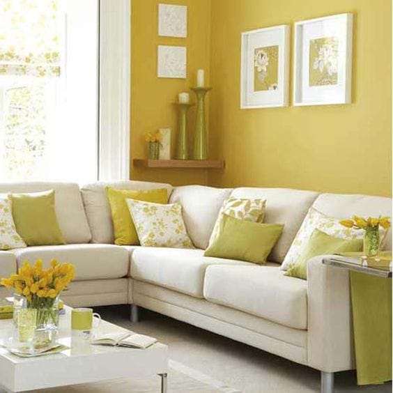 ¿Qué color de sofá pondrían en un comedor con paredes amarillas con un toque de naranja?