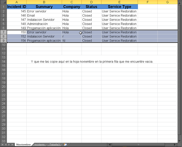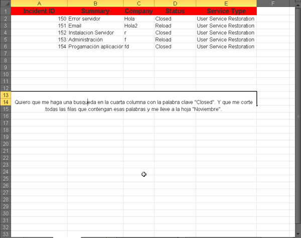 Tengo un documento Excel en el cual tengo varias tablas. Cada tabla tiene un tipo de incidencias que deben ser resultas y cuando están terminadas, los datos de estas incidencias tengo que enviarlas a una tabla donde son archivadas. El problema es que cada uno de estos procesos lo tengo que hacer manualmente. Entonces me gustaría saber cómo puedo hacer un código, que por ejemplo, diga búscame en la “columna D” de la tabla “Incidencias” todas las filas que contengan la palabra “closed” y córtame todas esas filas y pégamelas a partir de la última fila libre de la tabla “Noviembre” y bórrame las filas de la tabla “Incidencias” que han quedado vacías. Más o menos sería un estilo así. Si alguien pudiera explicarme un poco como hacerlo, estoy un poco perdido en este tema y tengo que hacer un proyecto con la formación que estoy haciendo para un departamento en el que me encuentro ahora y no se ni por dónde empezar.