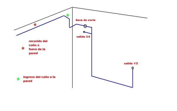 Les cuento, tengo la cañerías nuevas en termofusión de 3/4 de la bajada del tanque, en el baño anda perfecto el tema es en la cocina y el termo que me llega un chorrito... O puede que me falte presión, que tenga alguna obstrucción de que haya pegado mal algún caño (estoy al horno) o que tenga muchas vueltas (al horno con papas)... Lo cual dudo de todas y no quiero hacer macana o sea lo que pegue en el baño no tuve ningún problema de presión ni de obstrucción... ¿si fuera problema de presión supongo que con una bomba lo podría solucionar pero hay algún método de comprobar sin hay obstrucción sin romper? Porque tengo todo pintado y colocado los cerámicos... ¿pero we que me dicen? Ahí le mando un dibujo como es el recorrido ...