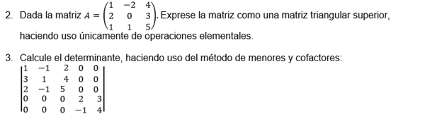 - Dada la matriz Exprese la matriz como una matriz triangular superior, haciendo uso únicamente de operaciones elementales.