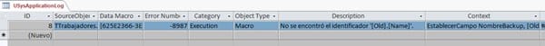7. Verifico el error que señala Access en la tabla USysApplicationLog en donde dice que no encontró el identificador [Old].[Name], que por cierto yo solicite [Old].[Nombre]: ID SourceObject Data Macro Instance ID Error Number Category Object Type Description Context Created 8 TTrabajadores.AfterDelete {625E2366-3E2E-4E72-8B51-494A0A36705F} -8987 Execution Macro No se encontró el identificador '[Old].[Name]'. EstablecerCampo NombreBackup, [Old].[Name] 07/12/2017 08:15:51