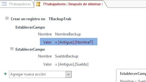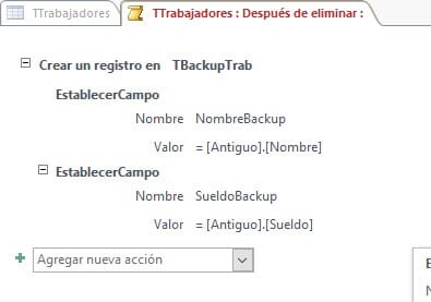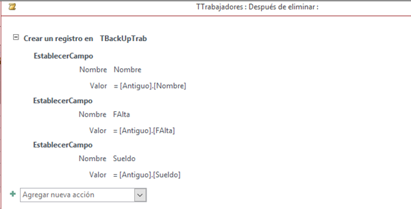 4. Luego hice la Macro Después de Eliminar en la tabla TTrabajadores. La macro debe crear un registro en la TBackup cada vez que se borre un registro en la TTrabajadores. En EstablecerCampo en el argumento "Nombre" puse el nombre del campo [NombreBackup] de la TBackupTrab porque allí es donde se debe guardar y en el argumento "Valor" puse el nombre del campo de la TTrabajadores con el prefijo Antiguo. Igual hice con el campo Sueldo