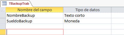 3. Luego cree una nueva tabla donde se guardarían los registros eliminados y la llame igual que lo hiciste tu TBackupTrab con los mismos campos de la tabla TTrabajadores pero agregándole el sufijo Backup para poder diferenciar los nombres de campos en la elaboración de la Macro de datos y para ver si el problema con el nombre de campo [Nombre] en las dos tablas era la causa del error.